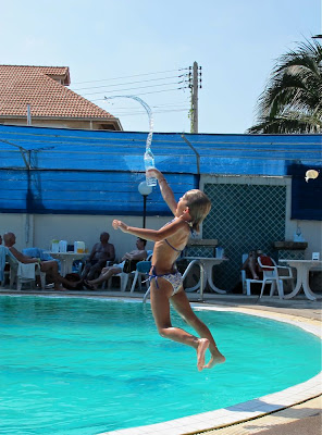 Viimeinen päivämme Pattiksella oli vielä vierailun iloa. Pitsinkien perhe tuli viettämään uima-allasaikaa kanssamme. Viimeiset auringonsäteet, uimahypyt, allasbaaripalvelut ja tappelut kavereiden kanssa kirjataan kokemusten kansioon. Iso pussillinen meille tarpeetonta tavaraa, mm. shampoota, liimaa ja kirjoja, jäi Pitsinkien käyttöön. Olipa vaan hyvä, ettei tarvinnut raahata kotiin, siinäkin säästyi useampi kilo muille tuliaisille.